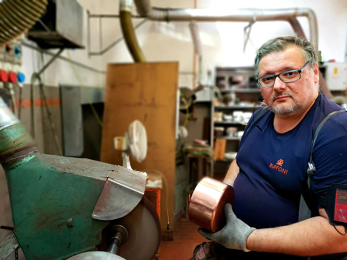 Corrado is our youngest team member: he attached handles, knobs and stamps the bottom of every item with the Ruffoni logo to ensure authenticity. He follows Nerio and Alan around the workshop to learn all the tricks of the trade: he is a keen learner and promises that soon the student will become the master!