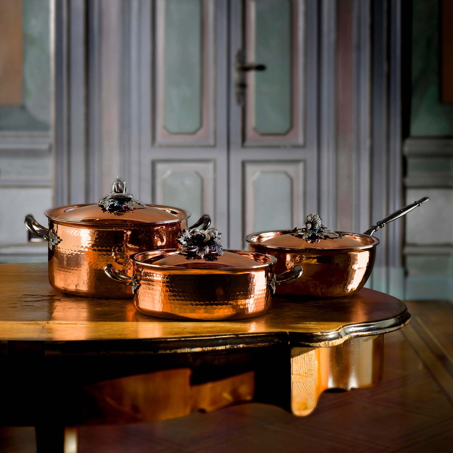 - Solid copper clad lids are enriched with finials in exquisite shapes of fruits and vegetables, hand cast in solid bronze and silver plated by our partner silversmiths