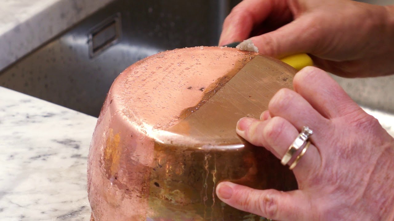 With use, copper develops a rich patina over time that many love and cherish. To restore a polished shine, use a good copper polish (like Ruffoni Cleaner) or salt with lemon juice/vinegar.